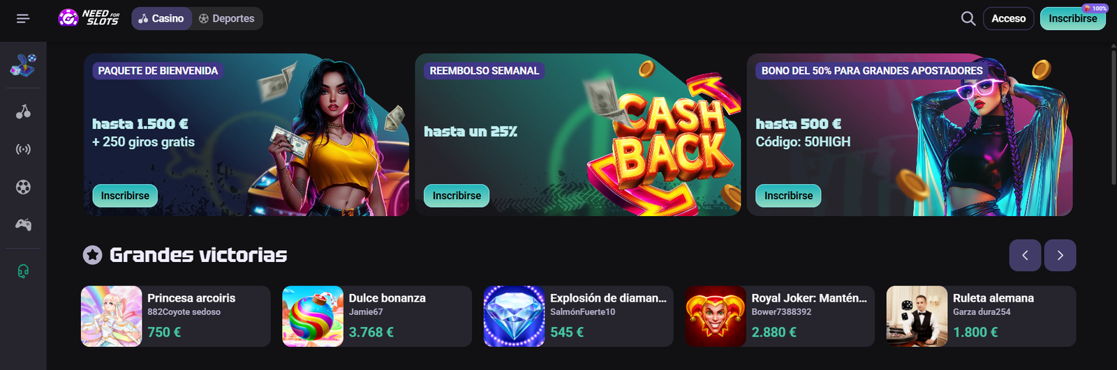 Los usuarios que ya están registrados en Casino NeedForSlots pueden disfrutar de bonos exclusivos y ofertas semanales. De esta manera, siempre tendrás la opción de jugar con saldo extra (basta con que cumplas con las condiciones).