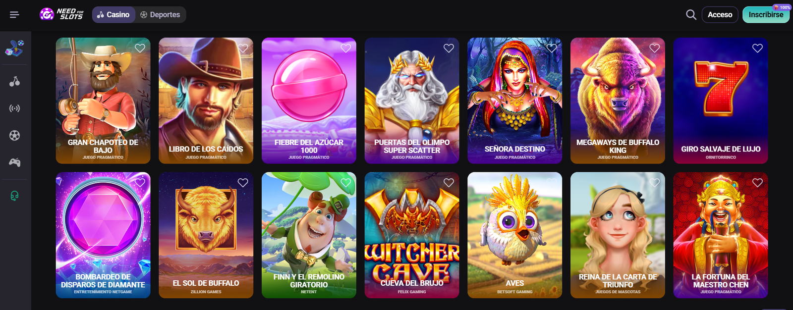 En NeedForSlots Casino encontrarás más de 6.000 juegos de azar diferentes. La plataforma está dividida en varias categorías e incluye a todos los clásicos que podrías esperar de un sitio de este estilo. Incluyendo: